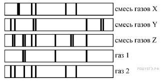На рисунке показаны спектры поглощения трёх смесей неизвестных газов (Х, Y и Z), а также спектры излучения известных газов 1 и 2. Какая из смесей содержит газ 1? В качестве ответа запишите букву, обозначающую смесь газов.