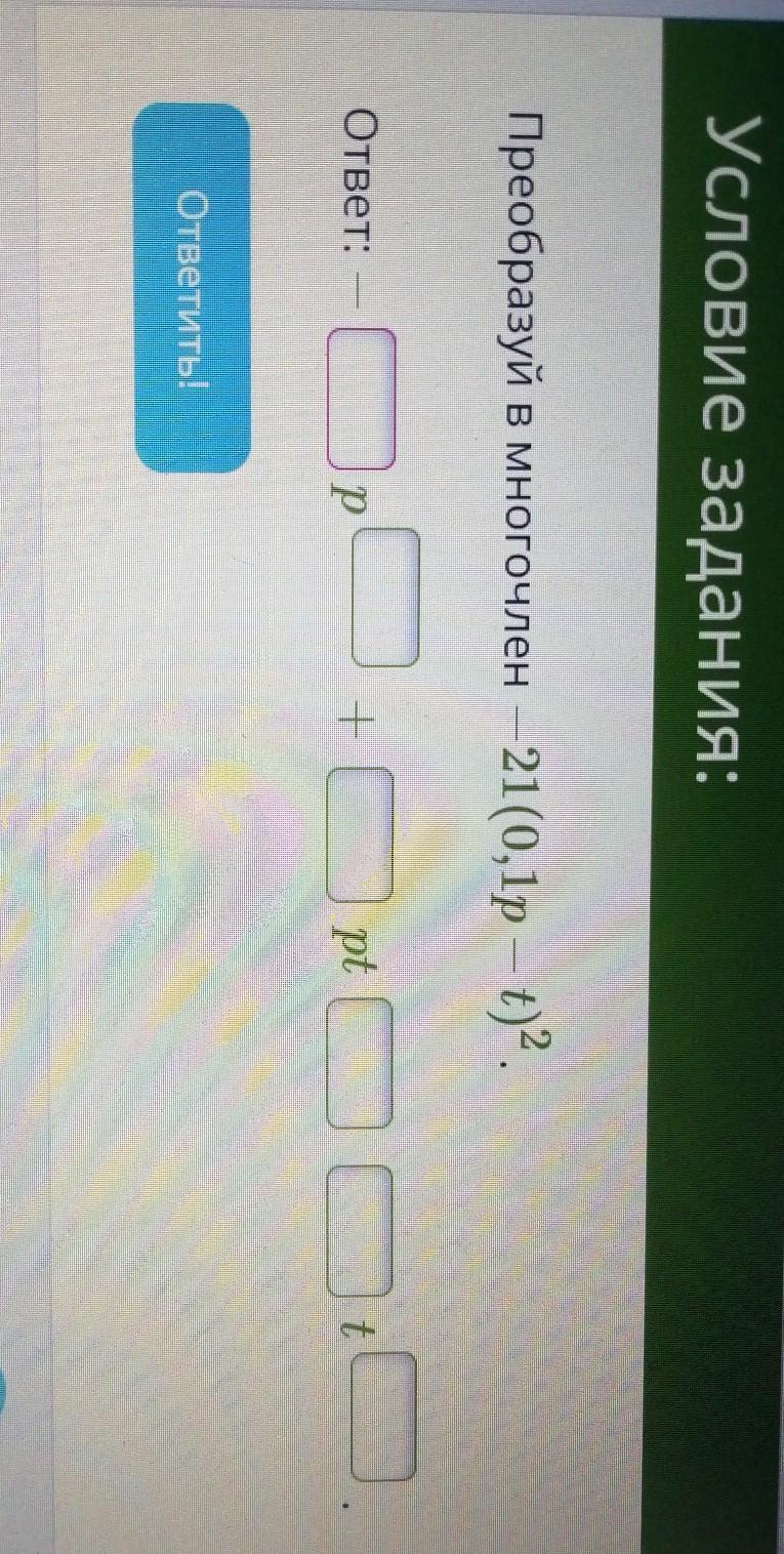 -21(0,1р-t)²= -21(0,01р²-0,2рt+t²)= -0,21р²+4,2рt-21t².
