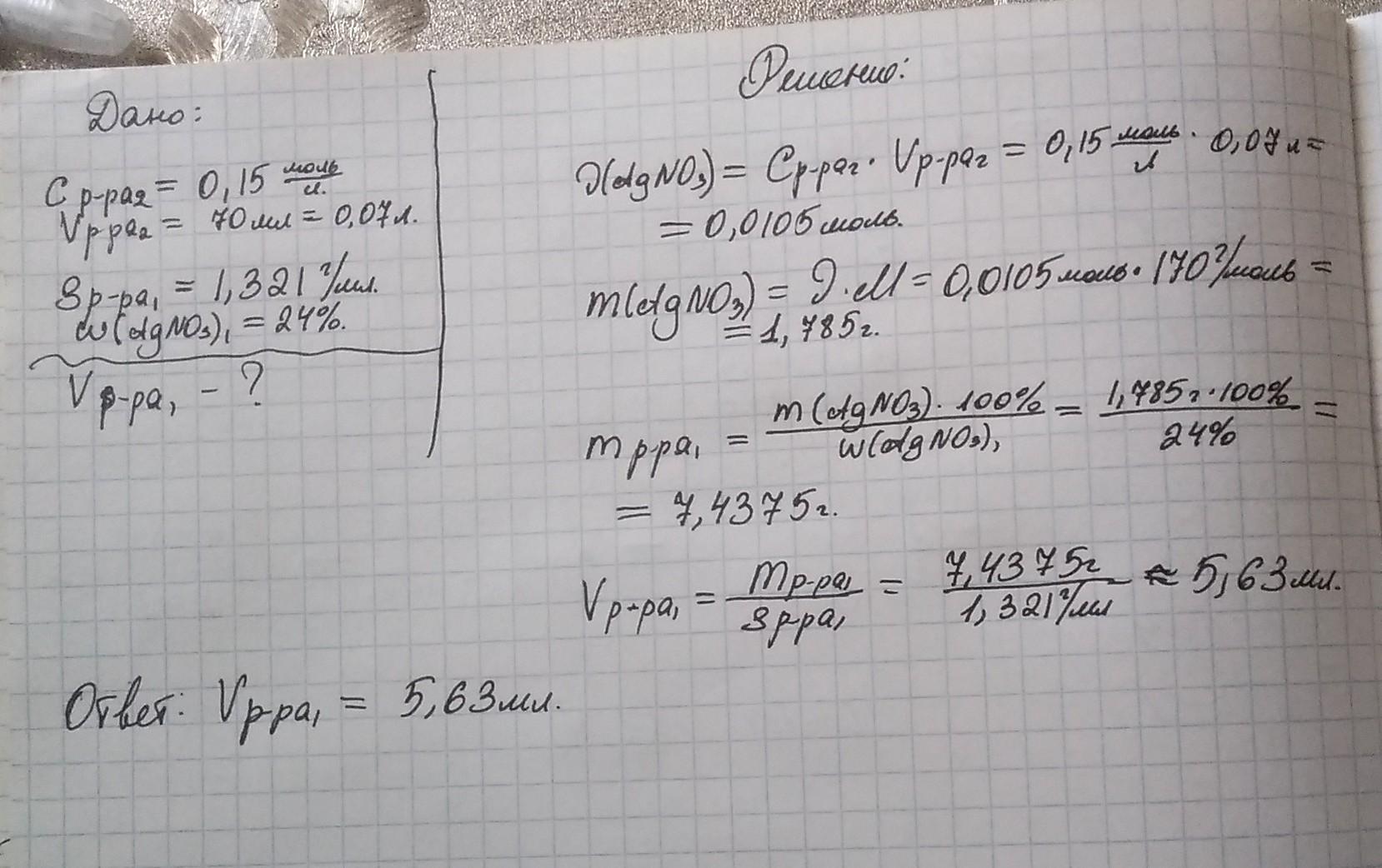Какой объем 24 %-ного (по массе) раствора вещества AgNO3 плотностью 1,321 г/мл необходимо взять для приготовления 70 мл раствора с молярной концентрацией 0,15 моль/л?