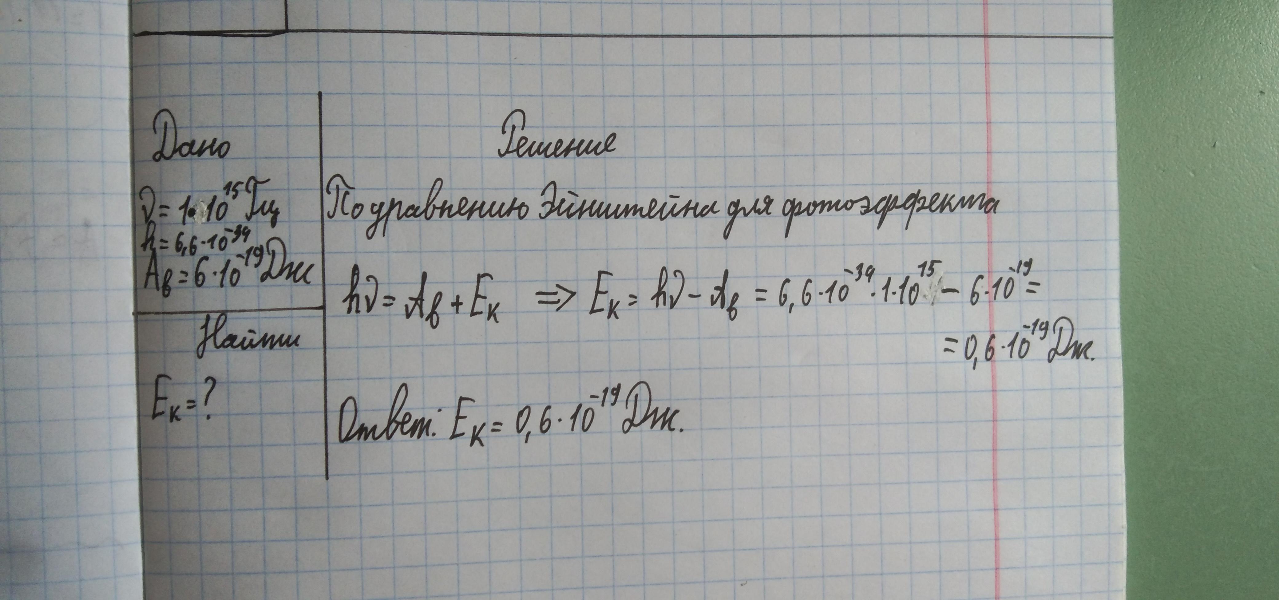 СРОЧНО ФИЗИКА 86 баллов , пожалуйста запишите на листочке и сфоткайте Поверхность цинка освещают ультрафиолетовым светом, частота которого 1 · 10 15 Гц. Определите кинетическую энергию фотоэлектронов, если работа выхода электронов равна 6 · 10 – 19 Дж.