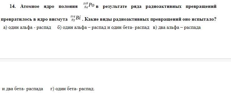 Атомное ядро полония в результате ряда радиоактивных превращений превратилось в ядро висмута . Какие виды радиоактивных превращений оно испытало? а) один альфа - распад б) один альфа – распад и один бета- распад в) два альфа – распада и два бета- распада г) один бета- распад.