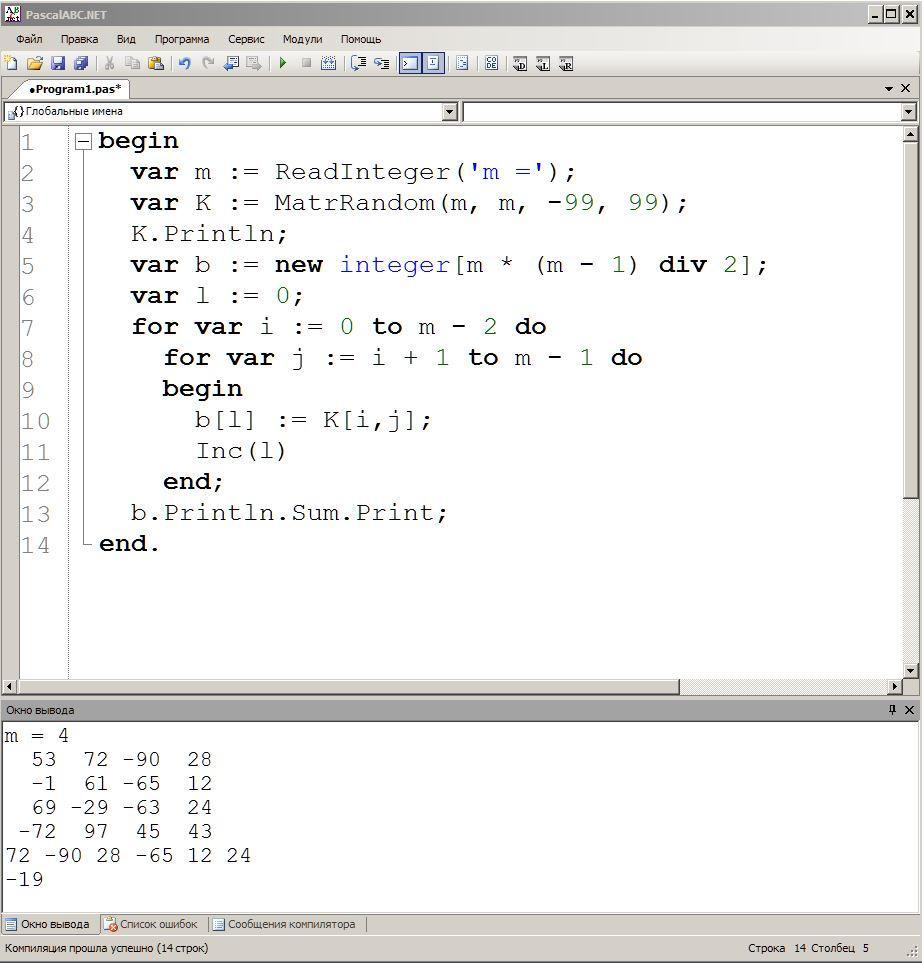 Сформировать одномерный массив из элементов, стоящих над главной диагональю матрицы K(m,m). Найти сумму элементов этого массива.