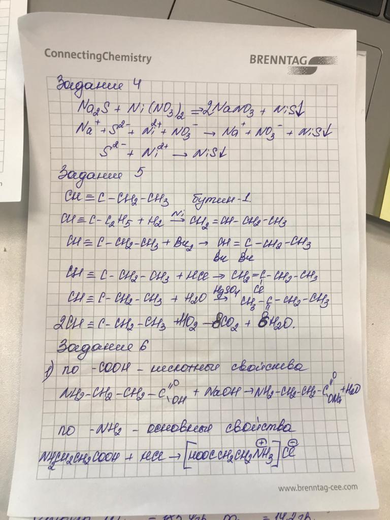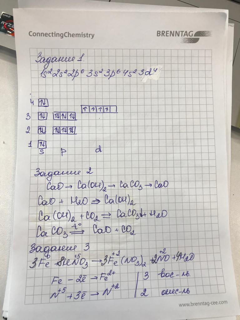 Срочно помогите.Даю всё что есть(85)баллов. Задачи должны иметь дано/найти/ и полный ход решения. Задание №1 Напишите электронную формулу и графическую схему атома хрома, и назовите к какому семейству элементов относится хром? Задание №2 Осуществите следующие превращения с написанием уравнением реакций с расстановкой коэффициентов: CaO Ca(OH)2 CaCO3 CaO Задание №3 Расставьте коэффициенты при помощи уравнений электронного баланса, укажите окислитель и восстановитель в следующей реакции: Fe+HNO3 Fe(NO3)2+ NO+H2O Задание №4 Напишите уравнение реакции ионного обмена между сульфидом натрия и нитратом никеля. (напишите в трех видах: молекулярном/ полном ионном/сокращенном) Задание №5 Дайте название веществу и напишите все химические реакции, в которое оно вступает: HC C - CH2–CH3 Задание №6 Объясните амфотерные свойства аминокислоты H2N - CH2- CH2 - COOH и подтвердите соответствующими уравнениями реакции Задание №7 Решите задачу с полным ходом решения: Вычислите массу карбида кальция, которая необходима для получения 100, 8 л. ацетилена Задание №8 Решите задачу с полным ходом решения: Какие массы оксида фосфора (V) и воды нужно взять чтобы получить 200 г. 10% раствора фосфорной кислоты
