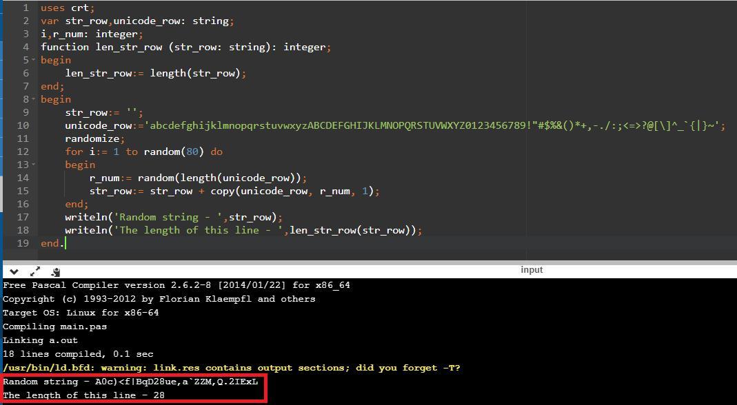 Код написан на Pascal, как и просили. Все ваши условия приняты во внимание. (Также прикрепил скриншот с кодом и выводом компилятора, вдруг понадобится) Держите: