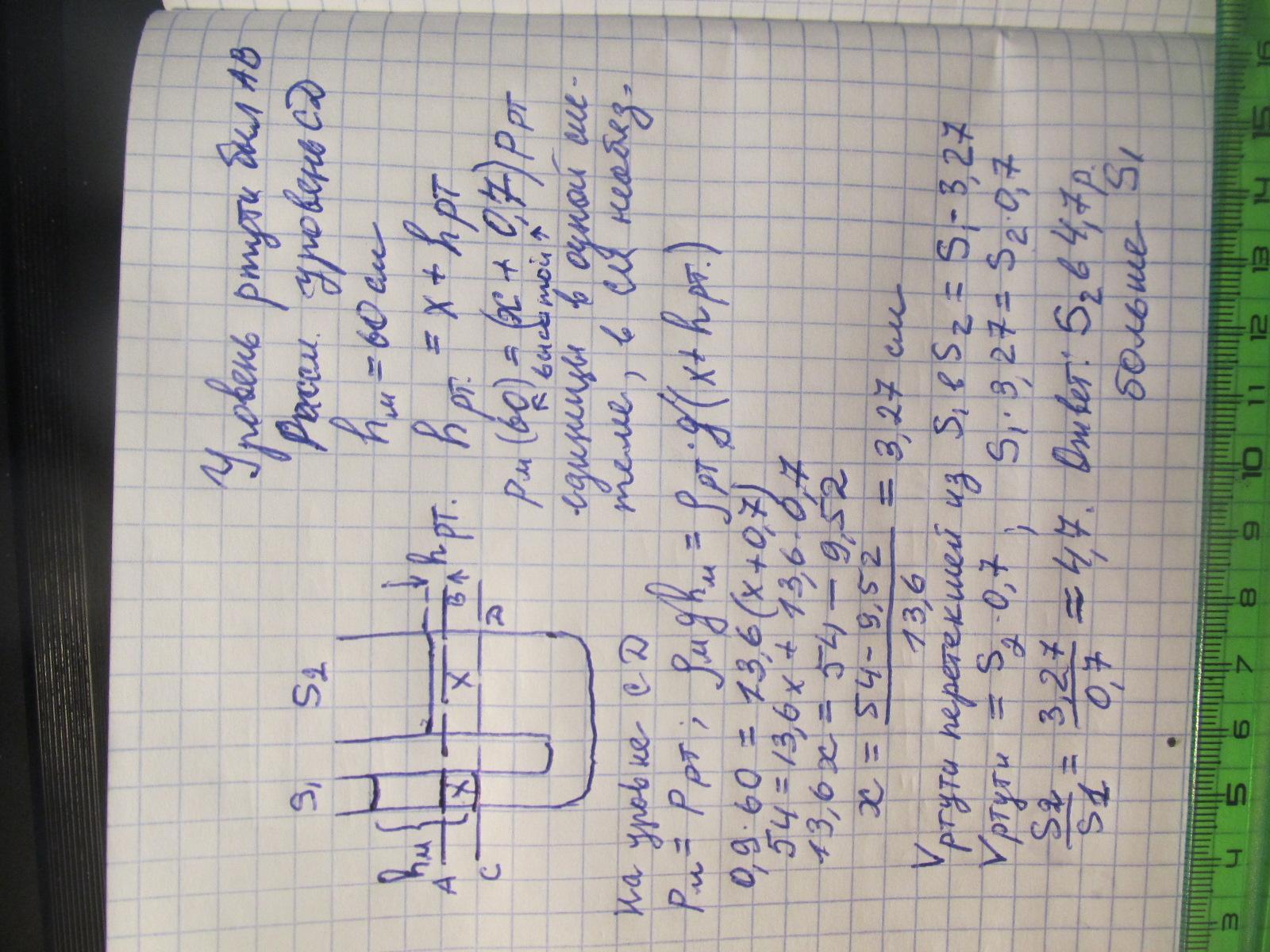 В сообщающихся сосудах разной площади сечения находится ртуть. После того как в узкий сосуд налили столб масла высотой 60 см уровень ртути в широком сосуде повысился на 0,7 см. Определите отношение площади сечения большого сосуда к площади сечения меньшего.