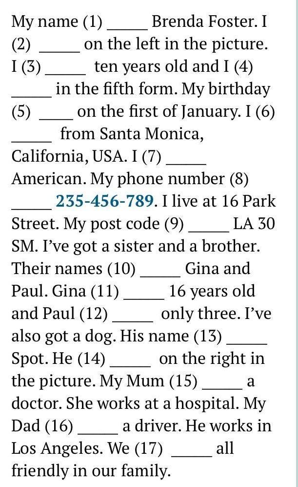 My name is Brenda Foster. I am on the left in the picture. I am ten years old and I am in the fifth form. My birthday is on the first of January. I am from Santa Monica, Сalifornia, USA. I am American. My phone number is 235-456-789. I live at 16 Park Street. My post code is LA 30 SM. I’ve got a sister and a brother. Their names are Gina and Paul. Gina is 16 years old and Paul is only three. I’ve also got a dog. His name is Spot. He is on the right in the picture. My Mum is a doctor. She works at a hospital. My Dad is a driver. He works in Los Angeles. We are all friendly in our family.