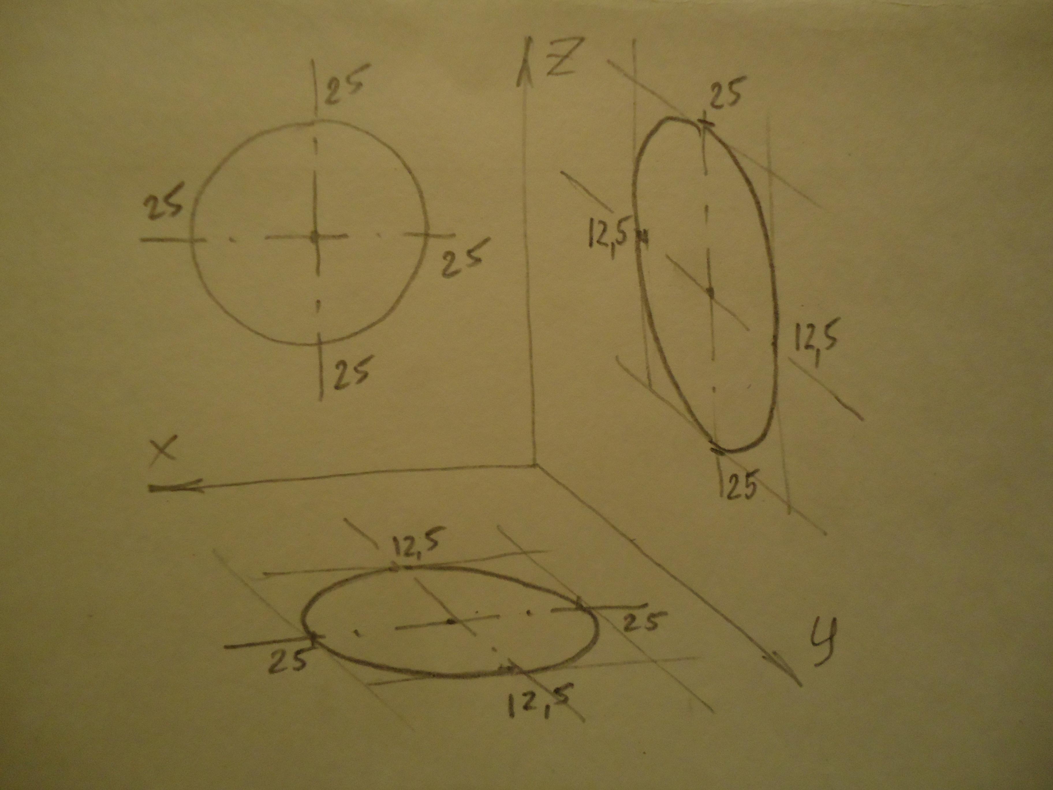На плоскости ху выберите центр окружности и проведите через него оси параллельно х и у. Отступите от центра окружности по оси влево и вправо по 25 мм, а по оси у в одну сторону и в другую от центра по 12,5 мм (т.к. по оси у размеры уменьшаются в два раза). Постройте ромб и с помощью лекала проведите линию овала.