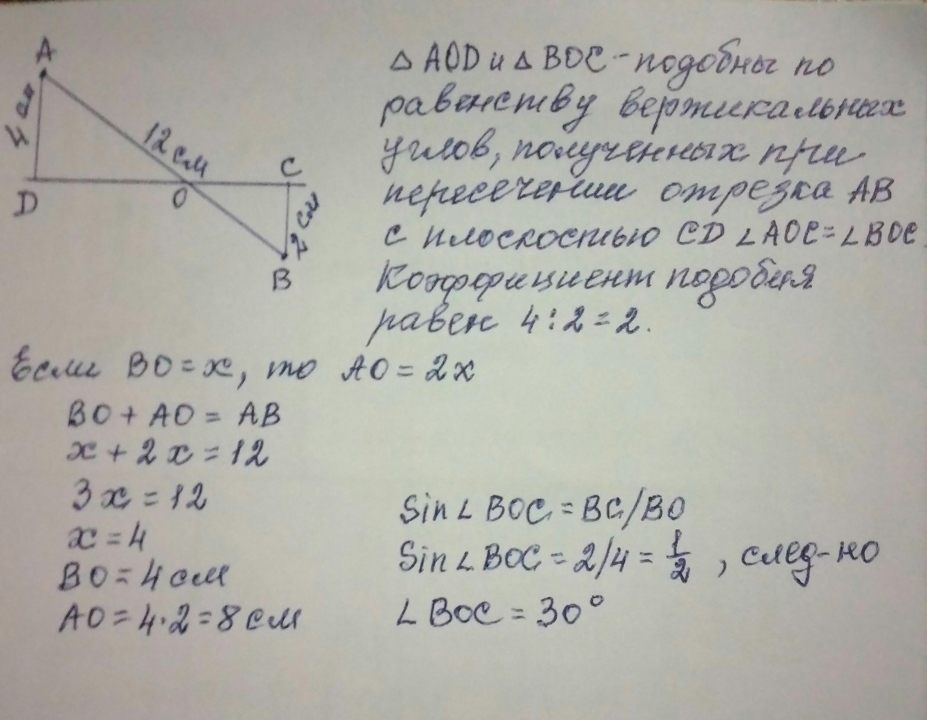 отрезок длиной 12 см пересекает плоскость, концы его находятся от плоскости на расстоянии 2 см и 4 см. найти угол между отрезком и плоскостью