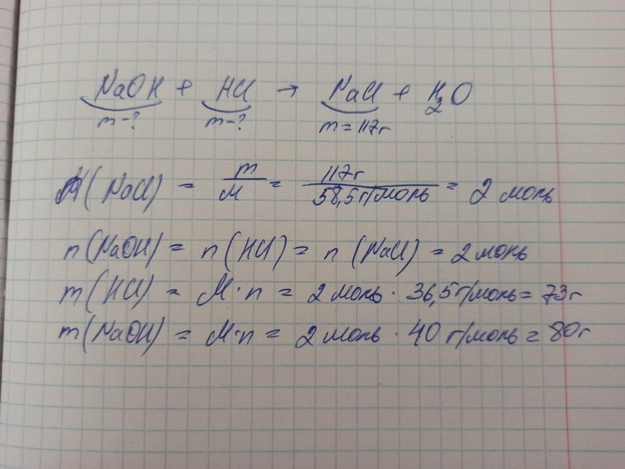 В результате реакции нейтрализации выделилось 117 г соли хлорида натрия. сколько граммов исходных веществ гидроксида натрия и соляной кислоты понадобилось доя этой реакции. спасибо за ответ