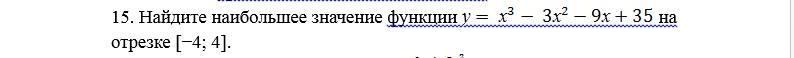 y=x^3-3x^2-9x+35\ \ ,\ \ x\in [-4\, ;\, 4\ ]\\\\y'=3x^2-6x-9=3(x^2-2x-3)=3(x-3)(x+1)=0\\\\x_1=3\ ,\ x_2=-1\\\\znaki\ y'(x):\ \ \ \ +++(-1)---(3)+++\\\\{}\qquad \qquad \qquad \quad \nearrow \ \ \ (-1)\ \ \ \searrow \ \ \ (3)\ \ \ \nearrow \\\\y(-4)=-41\ \ ,\ \ y(-1)=40\ \ ,\ \ y(3)=8\ \ ,\ \ y(4)=15\\\\y(naibol.)=y(-1)=40