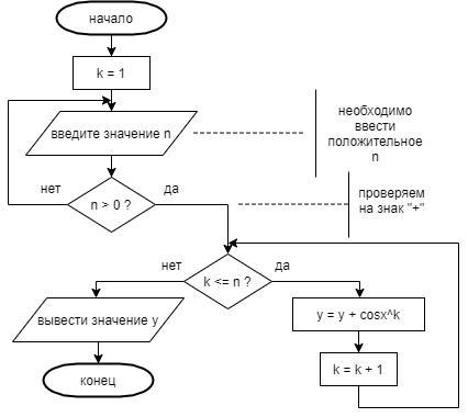Составьте, пожалуйста блок - схему алгоритма, вычисляющую сумму y=cosx+ cosx2+ cosx3+…+ cosxn (это степени) Именно блок схему, а не решение на языке программирования. Отдаю все баллы, надеюсь на помощь