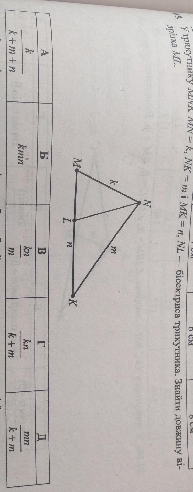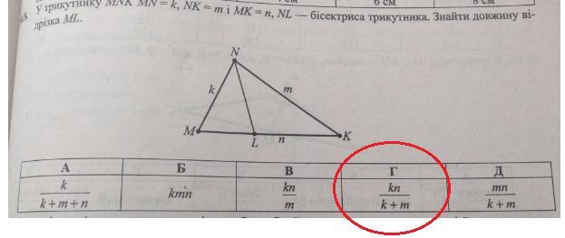 У трикутнику MNK MN=k, NK=m i MK=n, NL - бісектриса трикутника. Знайти довжину відрізка ML.