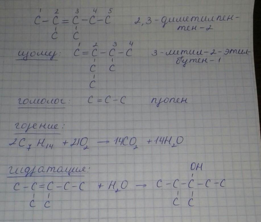 Составьте структурную формулу разветвленного алкена, молекула которого содержит 7 атомов углерода, - составьте структурную формулу изомера и гомолога этого вещества, назовите вещества по систематической номенклатуре, - составьте уравнение горения исходного вещества, - составьте уравнение гидратации исходного вещества.