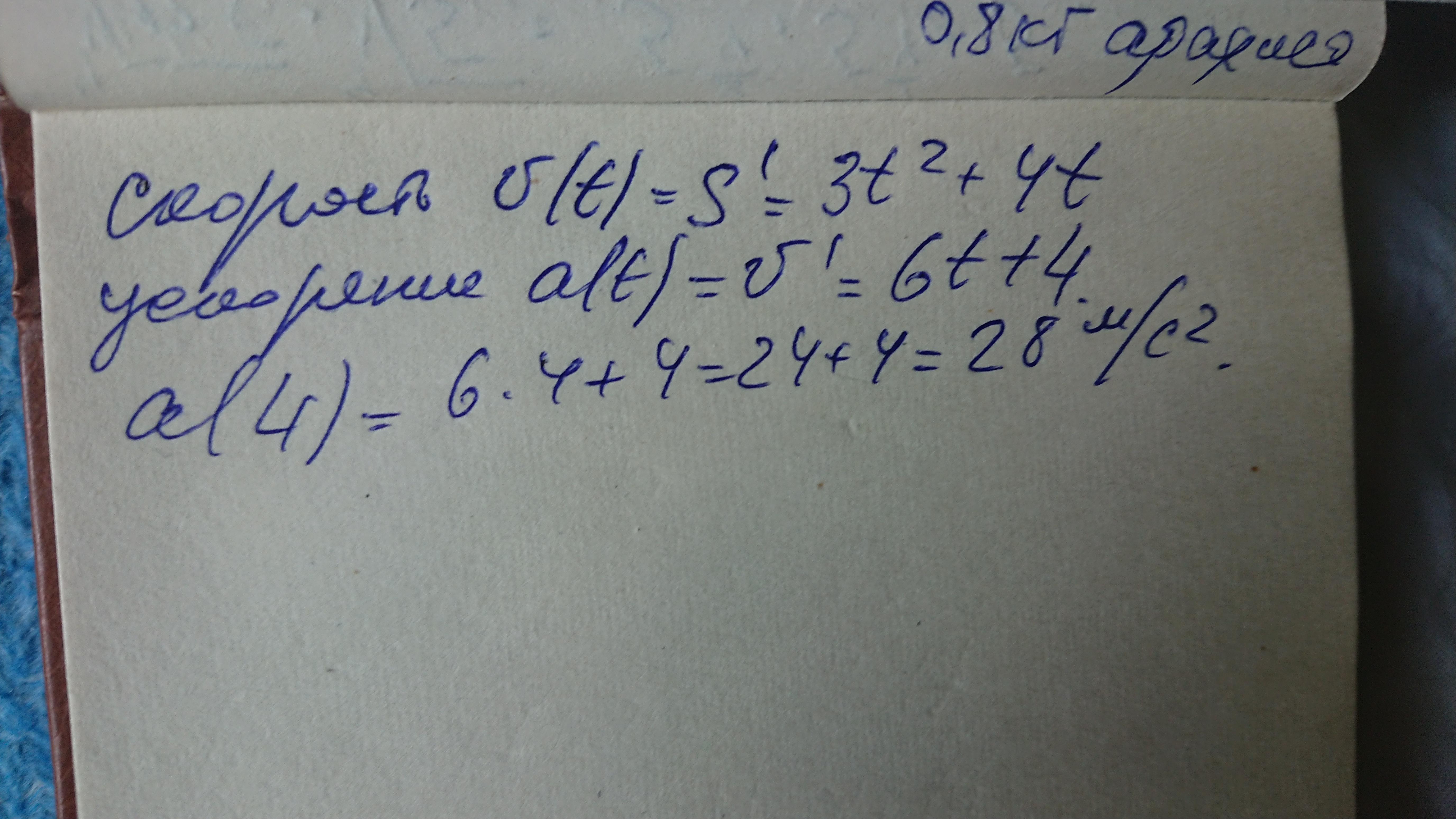 Тело движется по закону s(t)=t^3+2t^2+1 (s- в метрах, t- в секундах). Найдите ускорение тела через 4 секунды после начала движения.