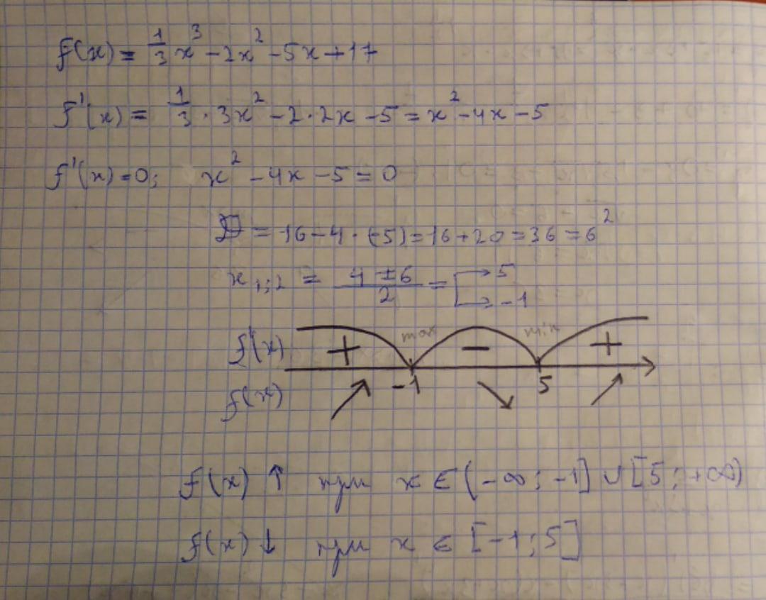 Найдите промежутки убывания функции f(x) =1/3x³-2x²-5x+17