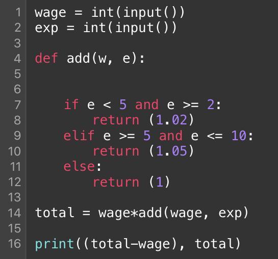 Рассчитать надбавку к зарплате за стаж, если стаж от 2 до 5 лет, надбавка составляет 2%, если стаж от 5 до 10 лет - 5%. Ввести с клавиатуры зар- плату и стаж, вывести надбавку и сумму к выплате. надо сделать в python