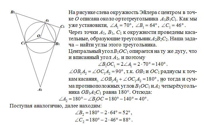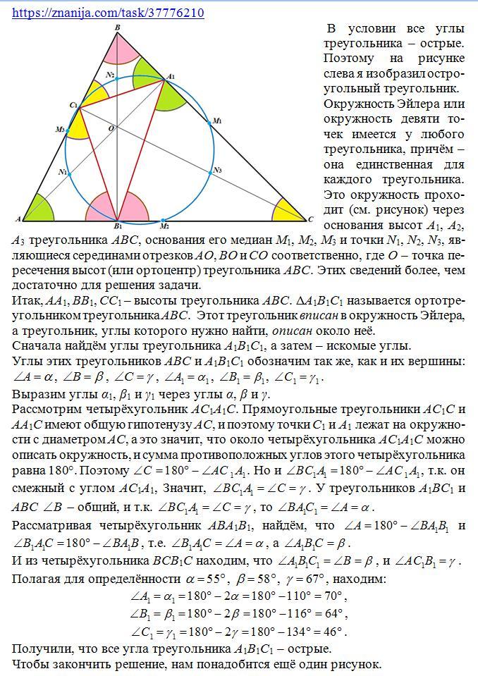 Через основания высот треугольника ABC проведены касательные к его окружности Эйлера. Эти касательные в пересечении образуют треугольник. Найдите его углы, если углы треугольника ABC равны 55∘, 58∘, 67∘.