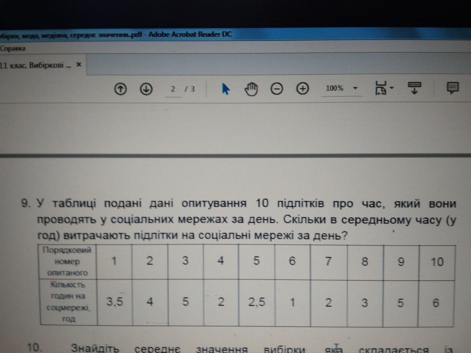 У таблиці подані дані опитування 10 підлітків про час, який вони проводять у соціальних мережах за день. Скільки в середньому часу (у год) витрачають підлітки на соціальні мережі за день? Порядковий номер опитаного 1 2 3 4 5 6 7 8 9 10 Кількість годин на соцмережі, год 3,5 4 5 2 2,5 1 2 3 5 6