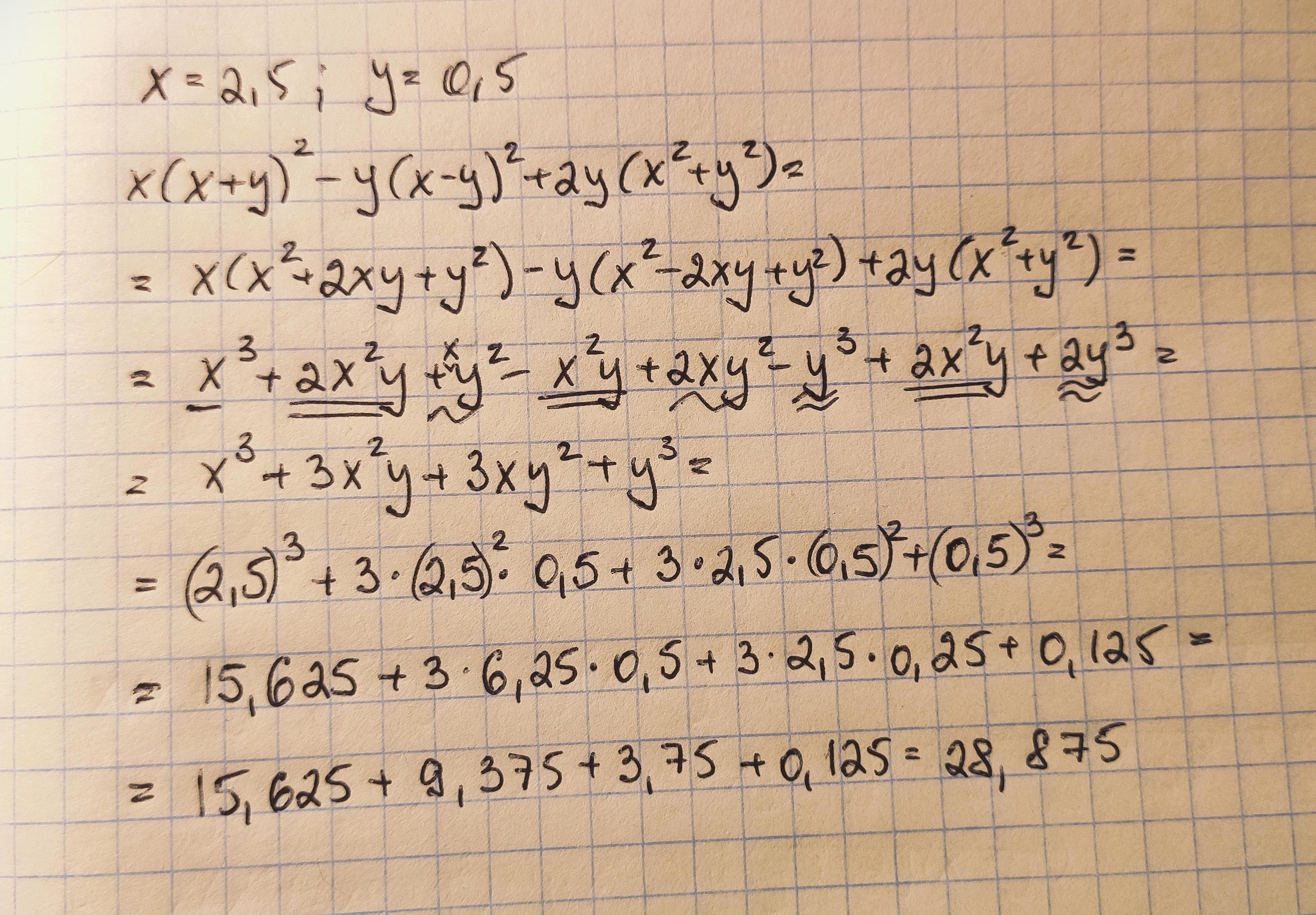 упростите выражениеи найдите его значение при x=2,5 y=1/2 x(x+y)^2-y(x-y)^2+2y(x^2+y^2)