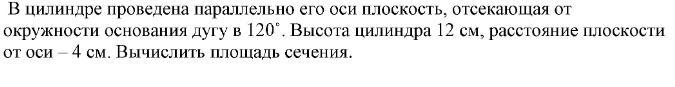 Хорда АВ -является шириной осевого сечения,а его длина равна высоте цилиндра.Соединим центр окружности О с точками А и В.Получился равнобедренный ΔАВО(АО=ВО как радиусы).Расстояние плоскости от оси ,назовём его ОН,является высотой треугольника АВО и равно 4 см (по условию)Угол АОВ -центральный и равен 120°(градусной мере дуги,на которую опирается)