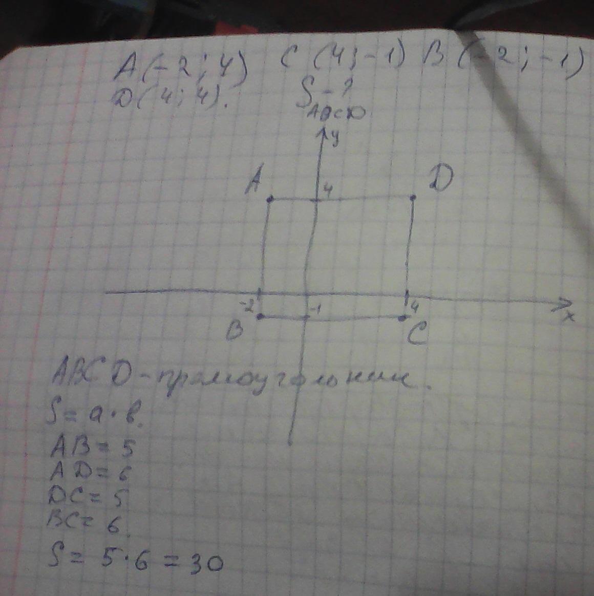 Изобразите в координатной плоскости точки А(−2; 4), С(4; −1), В(−2; −1) и D(4; 4) и найдите площадь фигуры АВСD.