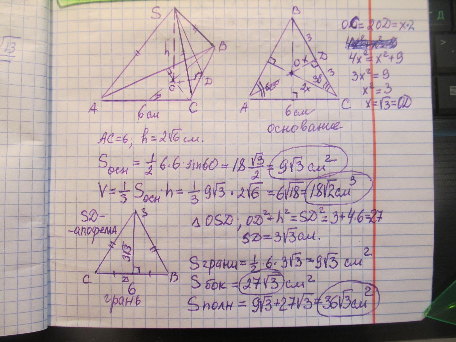 Сторона основания правильной треугольной пирамиды 6 см, а её высота 2 корней из 6 см. Найти полную поверхность и объём пирамиды.