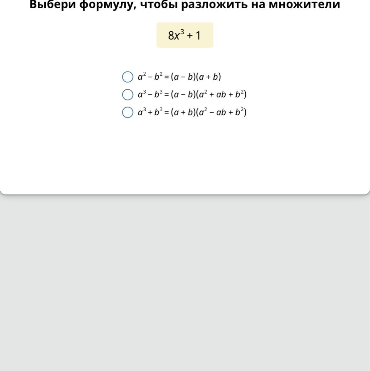 8а³ + 1 = (2а)³ + 1³ = (2а + 1)(4а² - 2а + 1).