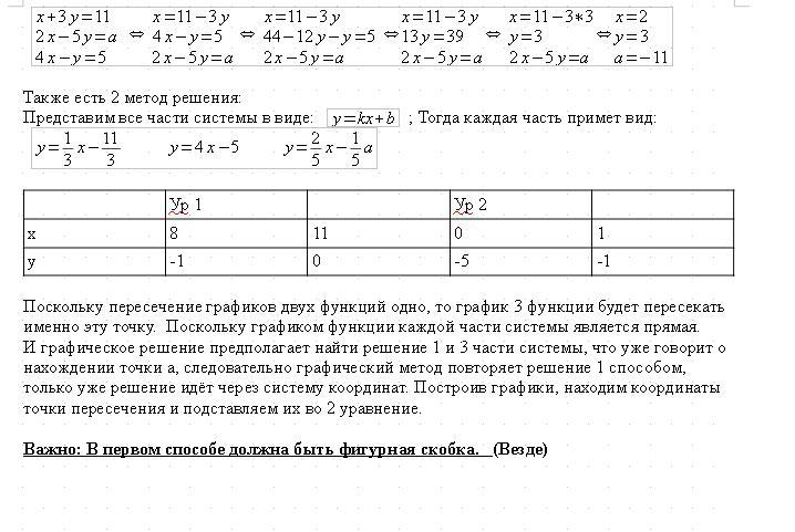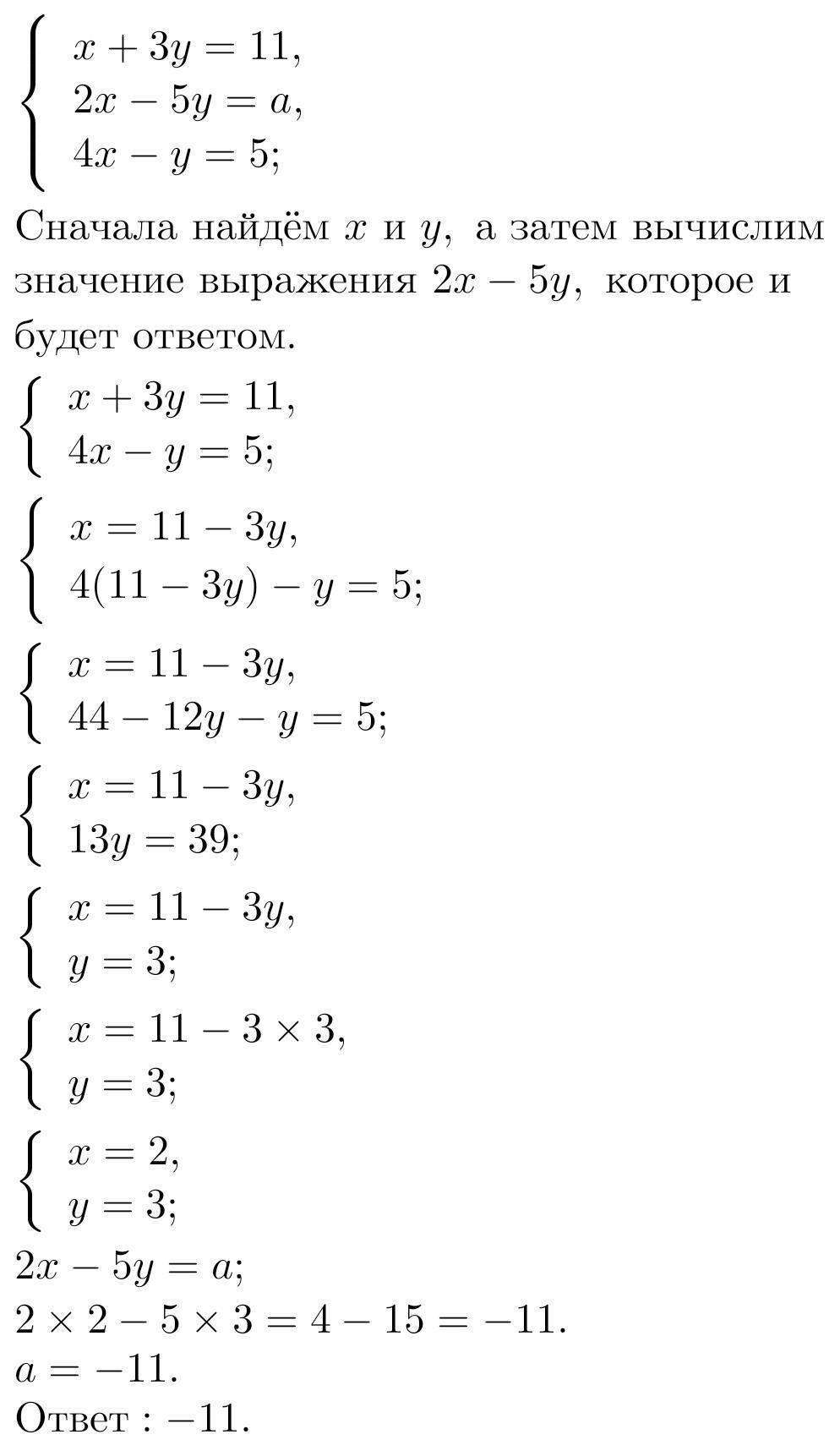 При каком значении a, система имеет решение? x+3y=11 2x-5y=a 4x-y=5 (ОТВЕТ -11 МНЕ НУЖНО РЕШЕНИЕ)