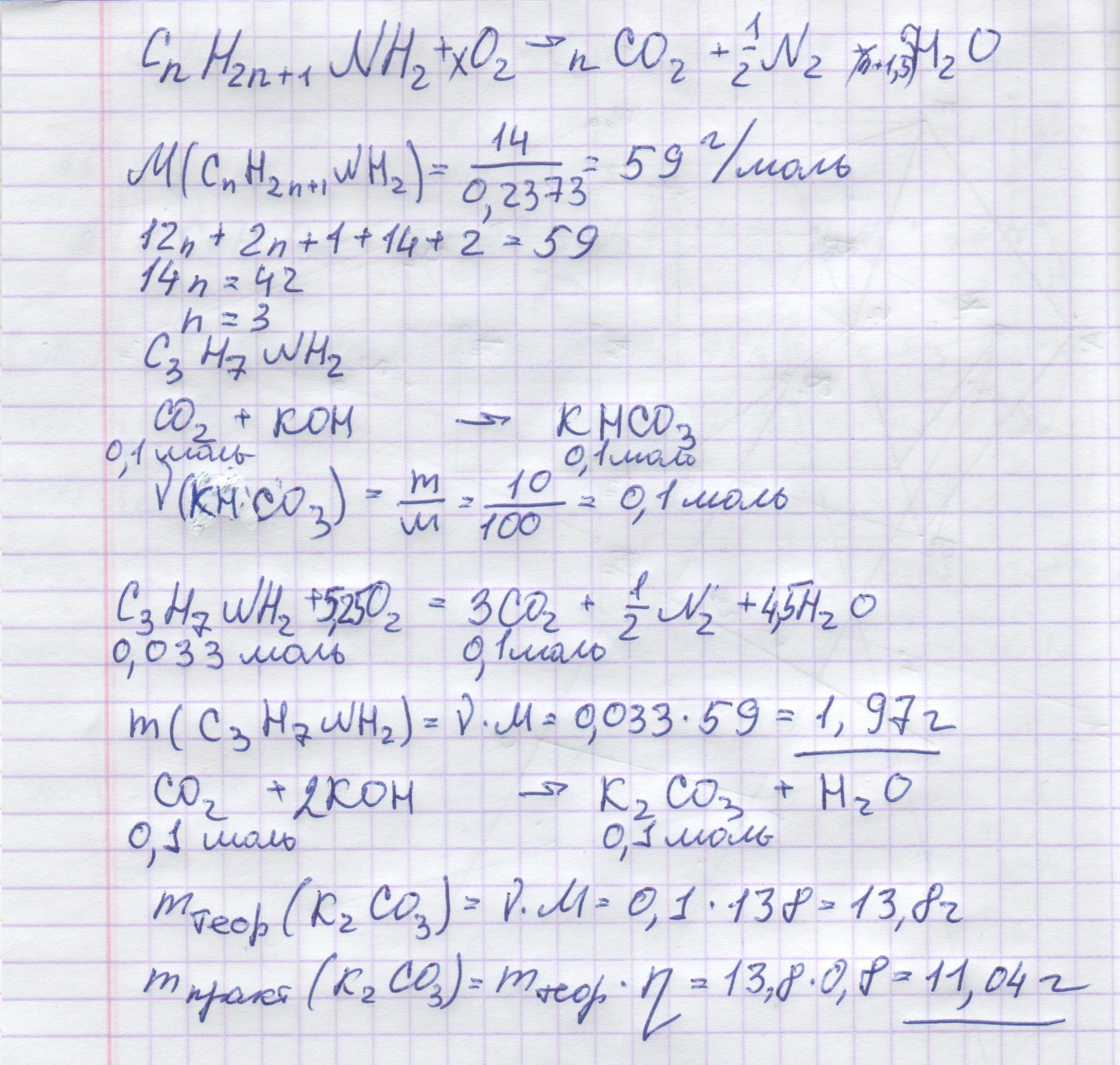 При сгорании первичного насыщенного алифатического амина, содержащего в молекуле 23,73 % азота, образовалось столько оксида углерода (IV), что из него можно получить 10 г KHCO3. Какая масса соединения сгорела и сколько можно из него получить К2СО3 при 80 %-ном выходе соли?