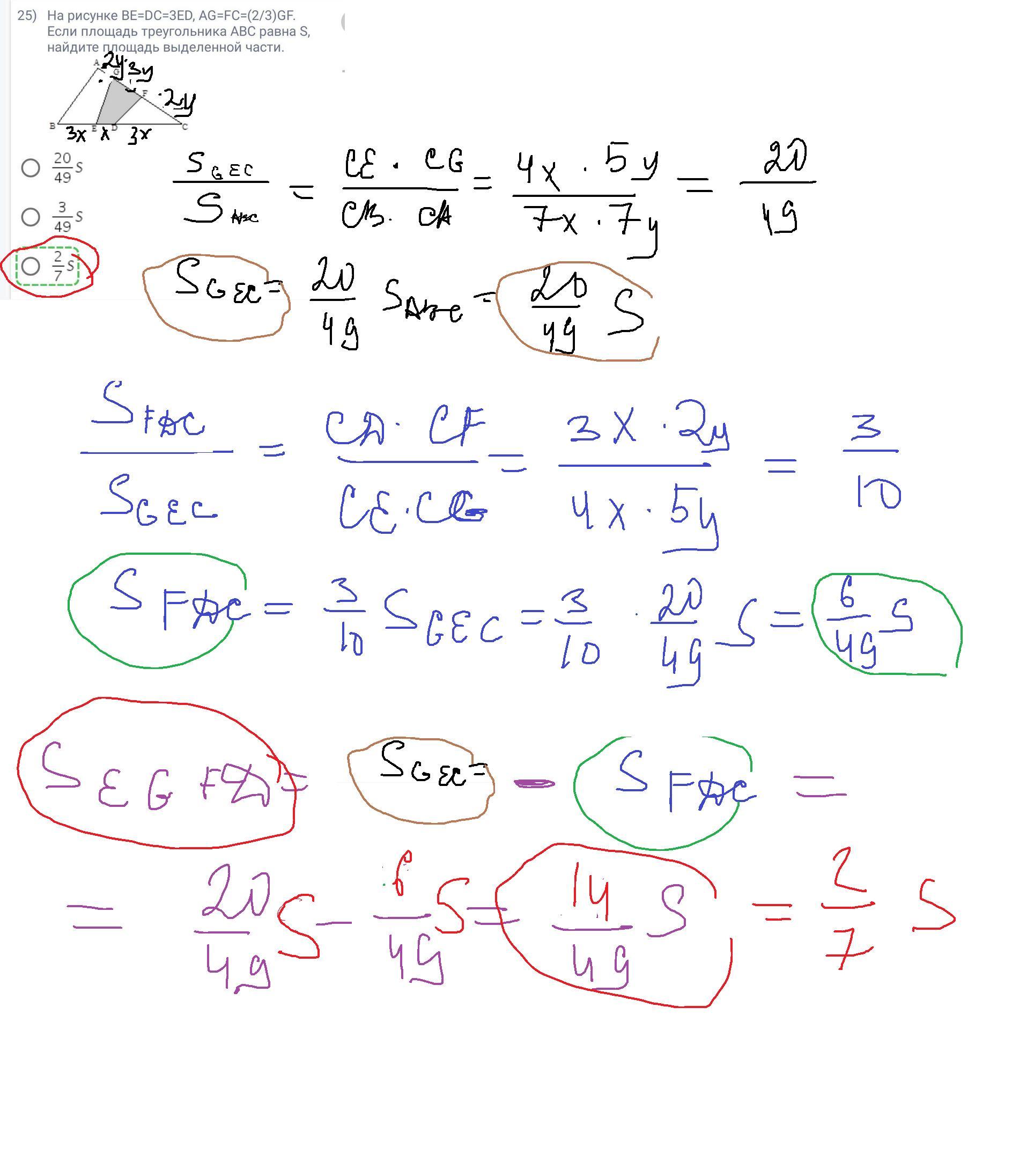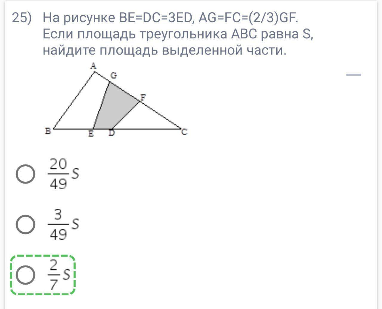 На рисунке BE=DC=3ED, AG=FC=(2/3)GF. Если площадь треугольника ABC равна S, найдите площадь выделенной части. (правильный ответ отмечен, мне нужно объяснение)