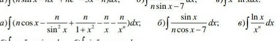б)∫(sinx/(ncosx-7))dx=-(1/n)∫d(ncosx-7)/(ncosx-7)=InI(n*cosx-7)I/n+c