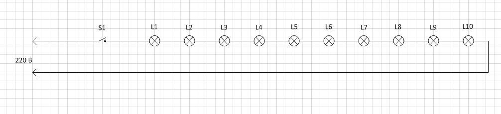 Составить и нарисовать схему подключения к сети 220В елочной гирлянды, состоящей из ламп напряжением 24В, рассчитав необходимое количество ламп(последовательное соединение).