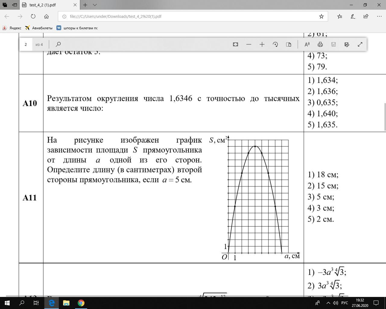 A11:На рисунке изображен график зависимости площади S прямоугольника от длины a одной из его сторон. Определите длину (в сантиметрах) второй стороны прямоугольника, если a= 5см