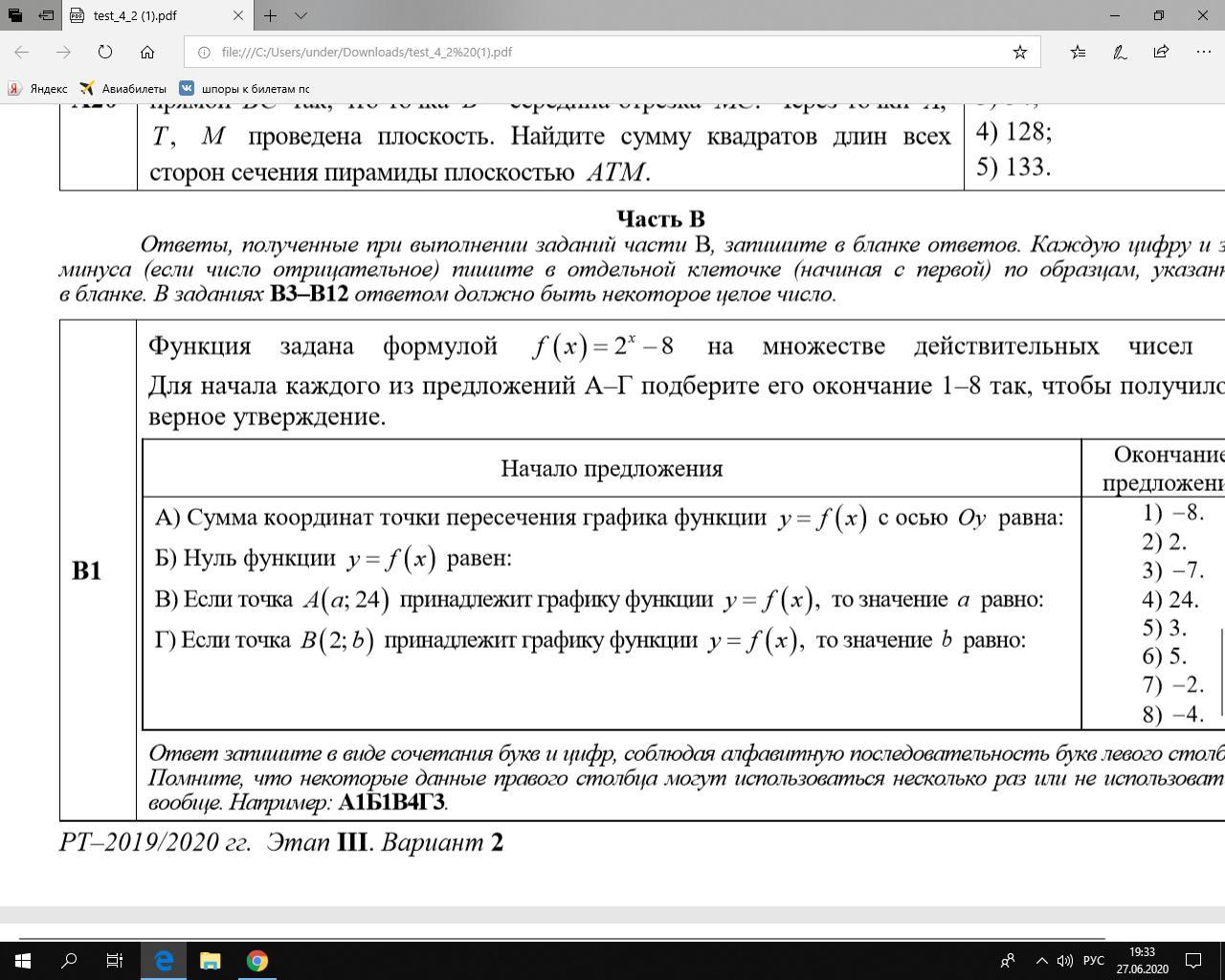 Y = 2 ^ 0 - 8 = 1 - 8 = - 7, а 0 + (-7) = - 7