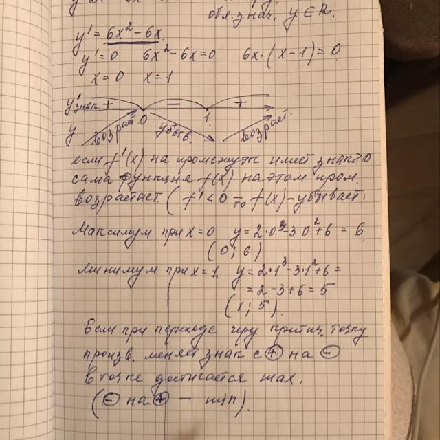 1. Исследовать функцию y=2x³-3x²+6 на промежутке монотонности и точки экстремума. (ВОЗМОЖНО НУЖЕН РИСУНОК)