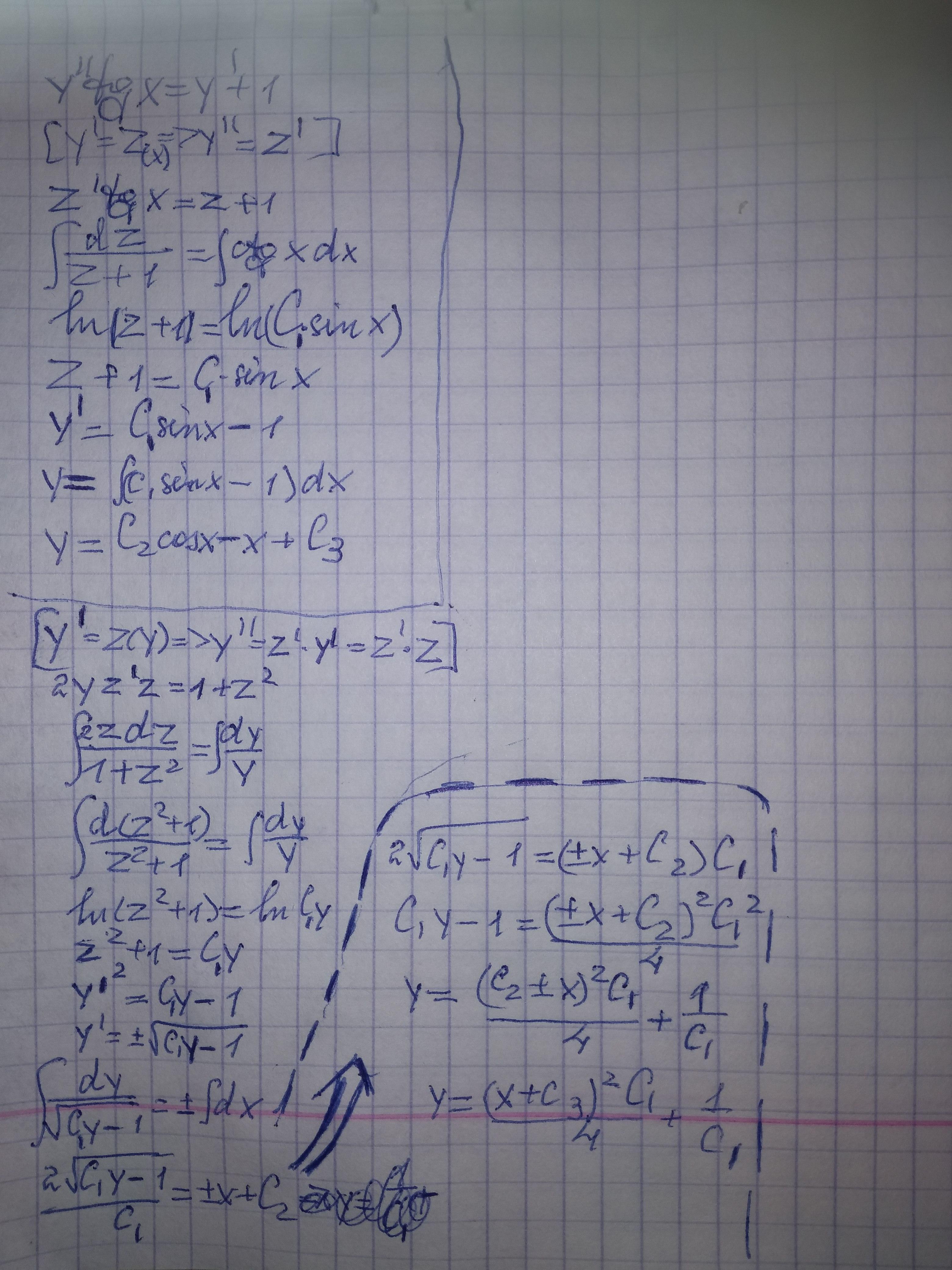 Также во 2ом номере после получения y'^2=C_1y-1 можно было подставить это уравнение связи в исходное, и получить совокупность y=0(не подходит) и y''=C_2, откуда общий вид решений - многочлены не выше 2ой степени, останется лишь подставить его в исходное уравнение, чтобы получить связь между константами. Какой способ легче - Вам решать