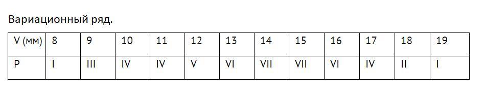 - Постройте вариационный ряд, в котором V – длина семян, а Р – частота встречаемости. (Мой совет вам: измеряя все семена, записывайте на черновике их длину, а затем складывайте семена с одинаковой длиной в одну кучку. Так вам будет удобнее подсчитать их количество и определить частоту встречаемости.)
