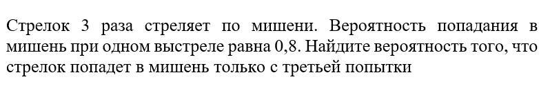 Нужно получить комбинацию «не попал – не попал – попал». Вероятность такой комбинации будет равна: