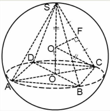 Обозначим данную описанную правильную четырёхугольную пирамиду в шар буквами SABCD.