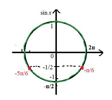 Пока мы перемещаемся от левого конца отрезка - точки -п/2 - до правого, т.е. точки 2п (а эта точка совпадает с нулем), мы попадаем в точку -5п/6 единожны, в точку -п/6 - дважды, т.е. корней на отрезке будет 3.