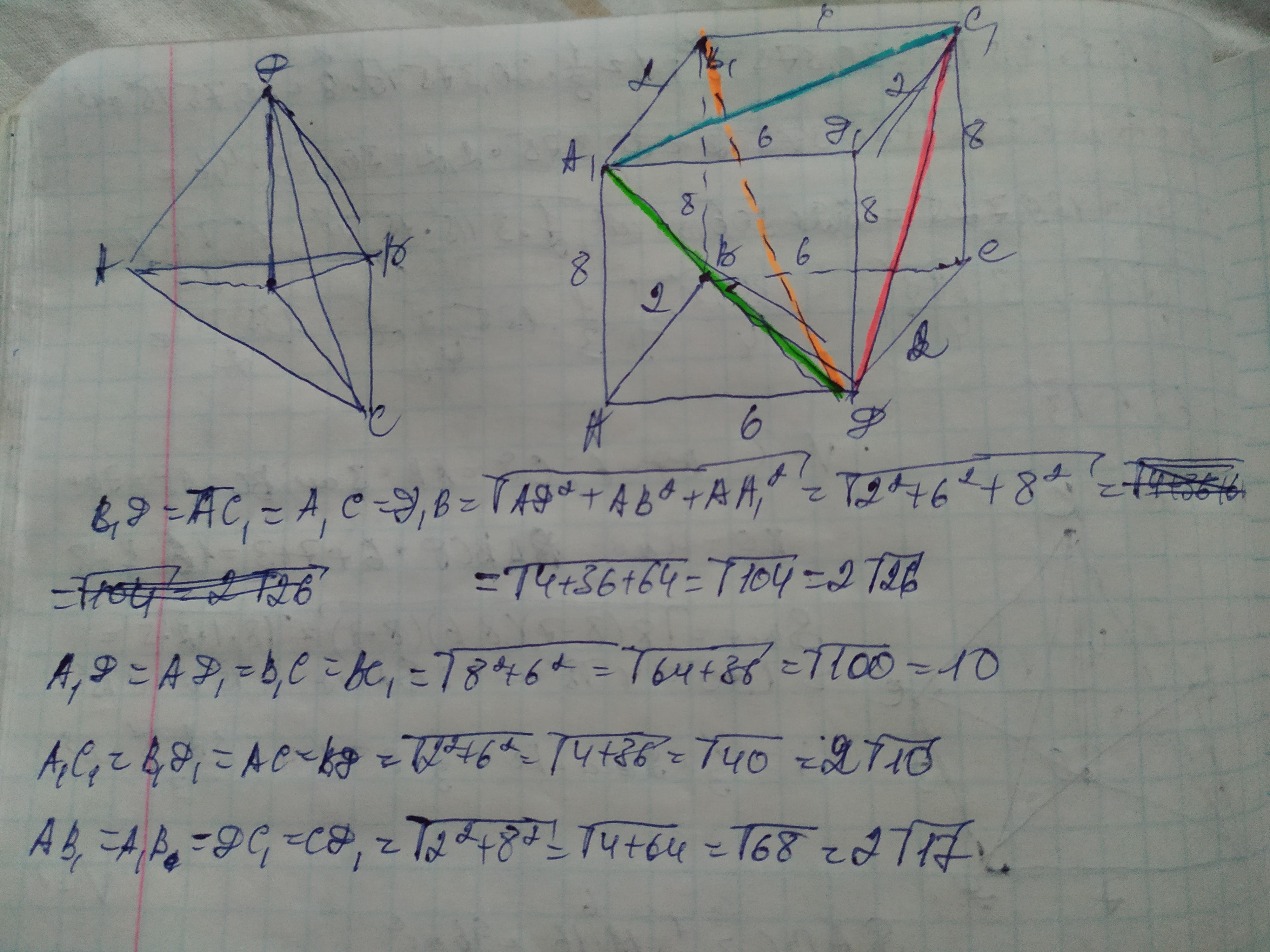 Рёбра прямоугольного параллелепипеда равны 2, 6, и 8. Вычислите диагональ параллелепипеда и длины диагоналей боковых граней.
