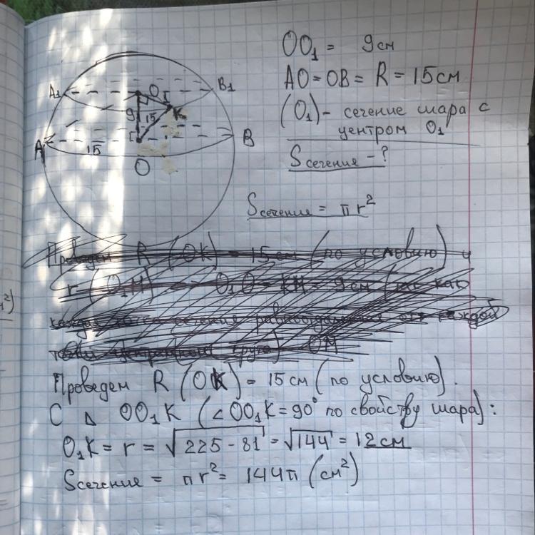 Шар радиуса 15см пересечен плоскостью, находящейся на расстоянии 9см от центра. Найти площадь сечения.
