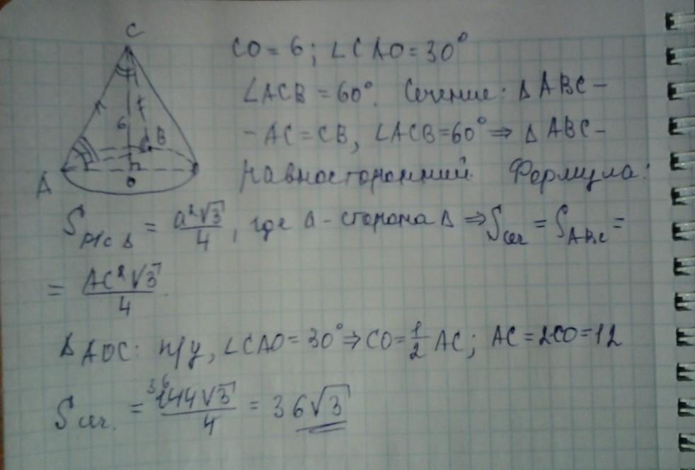 Найдите площадь полной поверхности конуса, если образующая наклона к плоскости основания под углом 30 градусов, а высота равна 6см.
