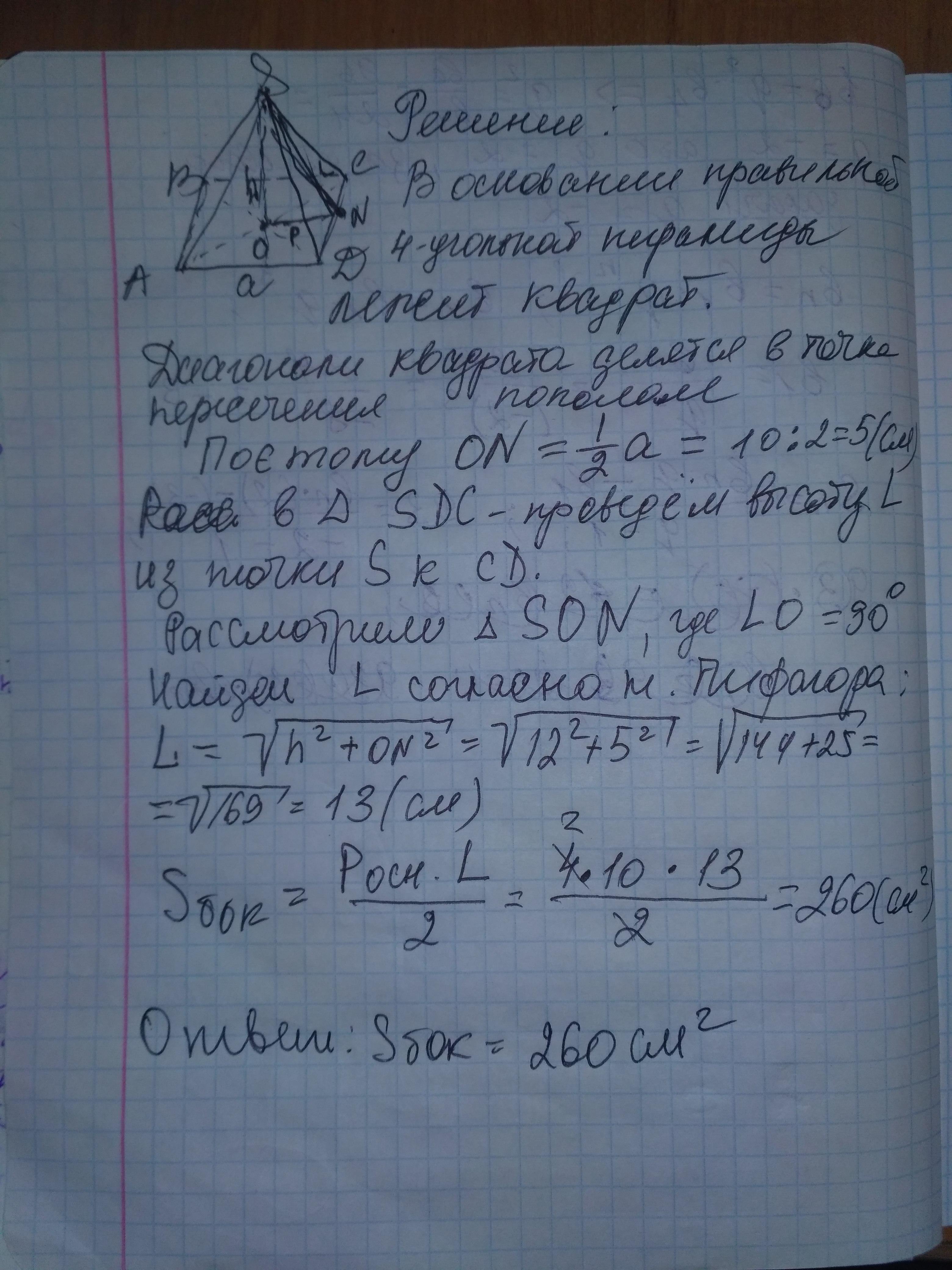 Дано: Правильная четырёхугольная призма, h=12см, a=10 см