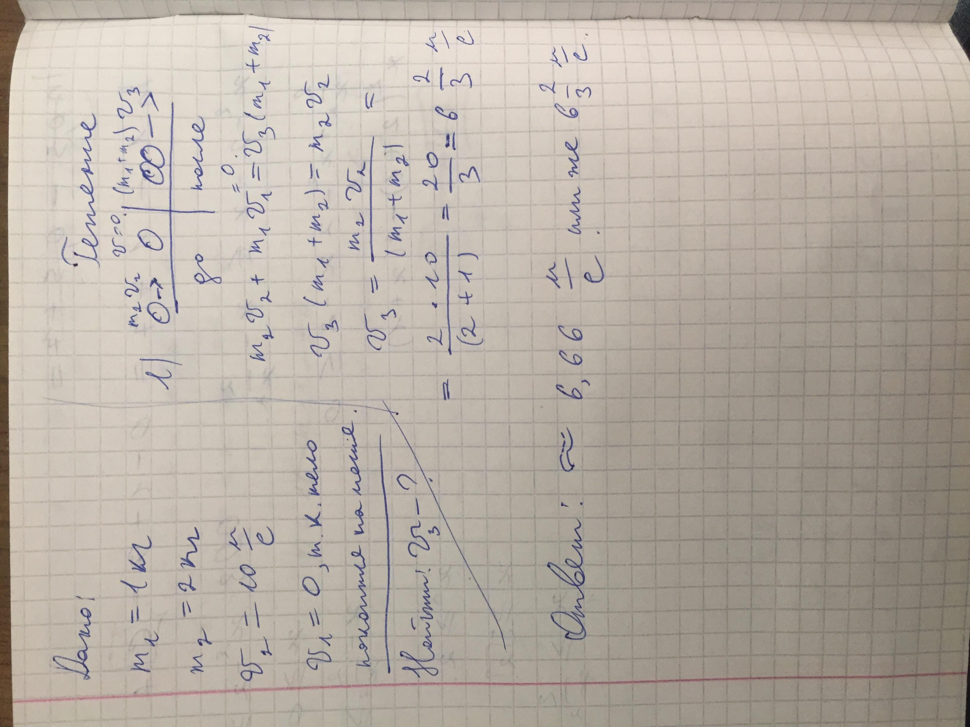 в покоящееся тело массой 1 кг ударилось тело массой 2 кг со скоростью 10 м с. найти скорость двух этих тел если они начали двигаться в мести