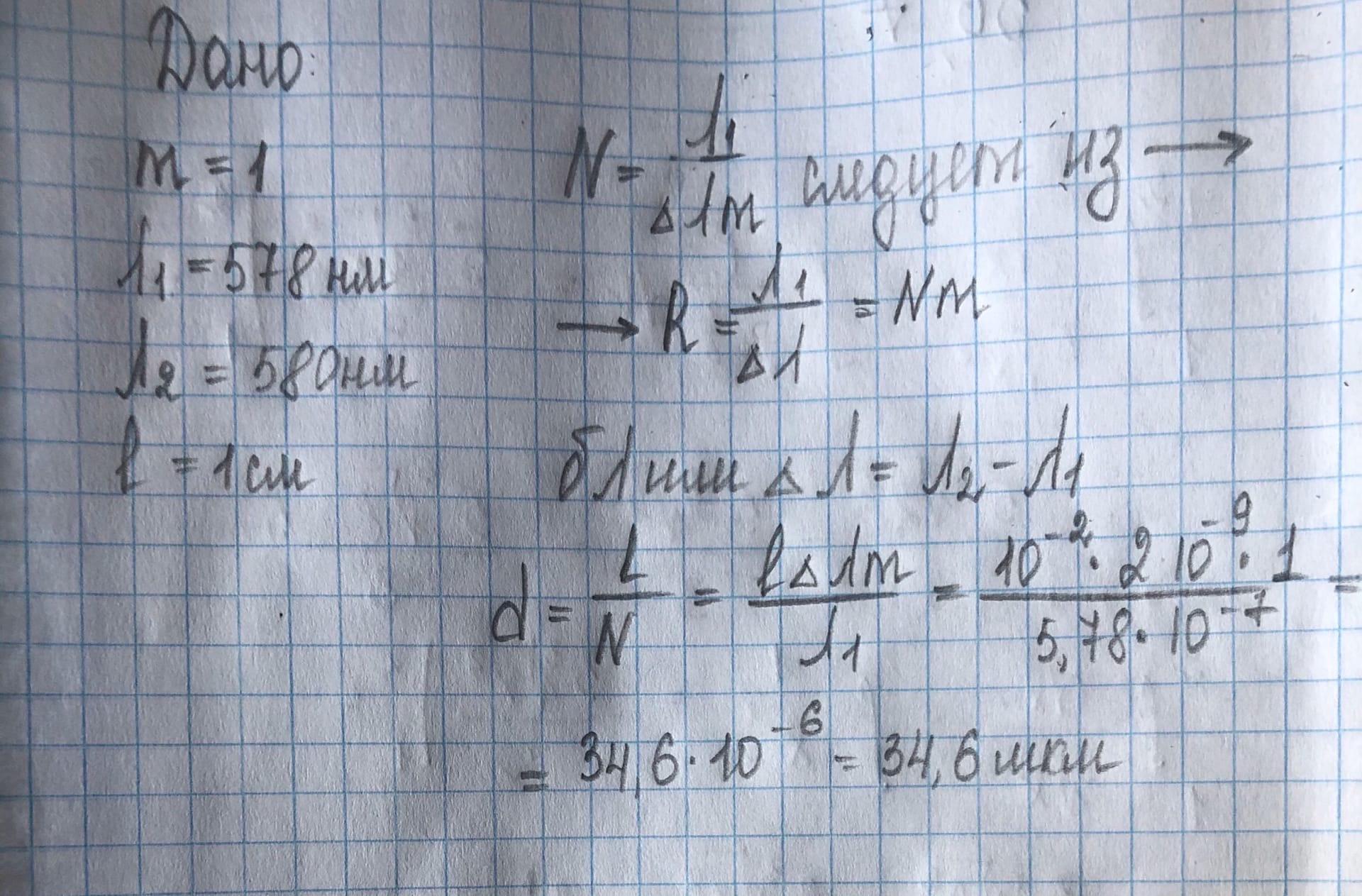Определите постоянную дифракционной решетки, если она в первом порядке разрешает две спектральные линии калия (λ1 = 578 нм и λ2 = 580 нм). Длина решетки l = 1 см.