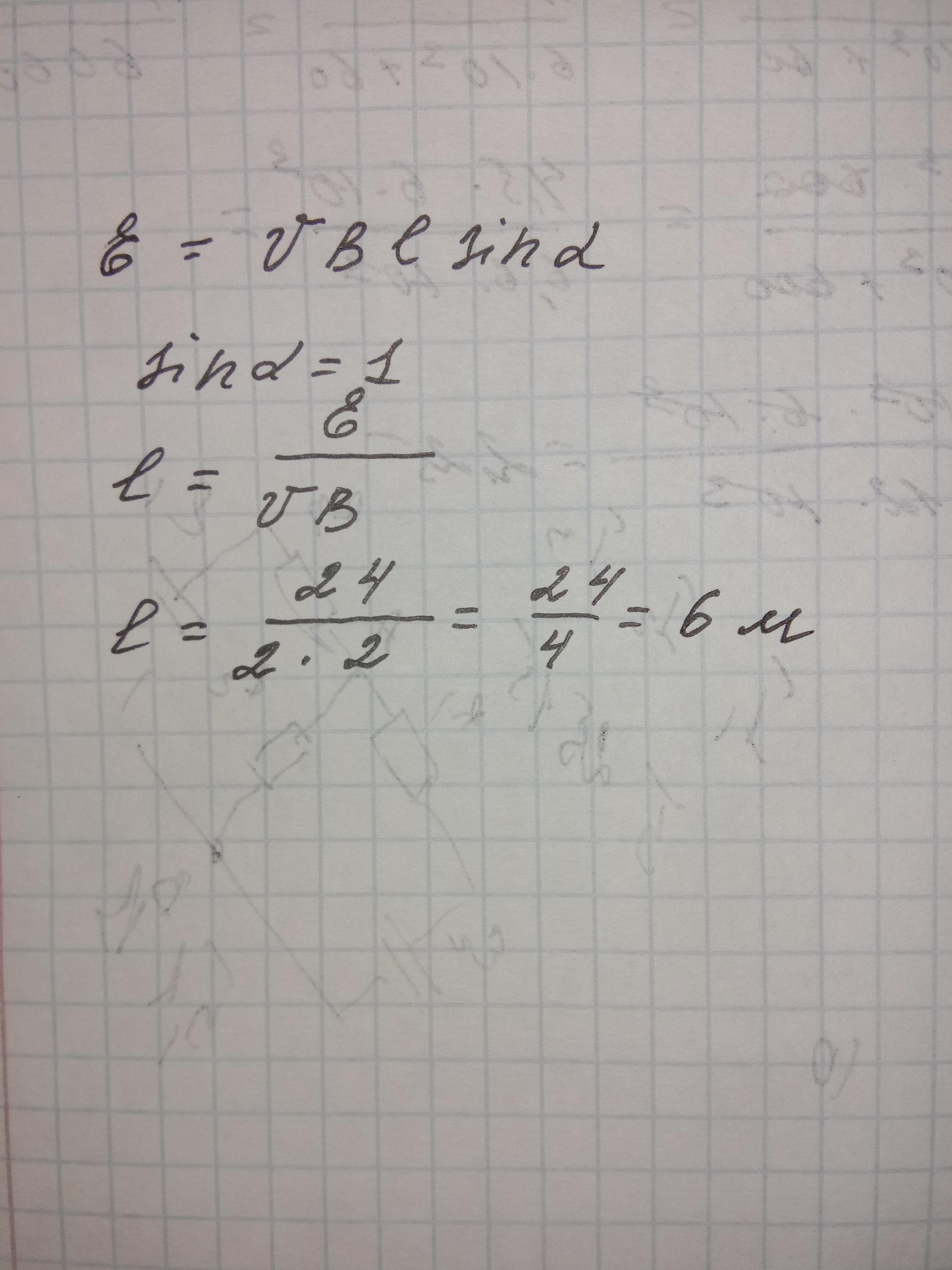проводник перемещается в поле с индукцией 2Тл., ЭДС индукции в рабочей части проводника 24В. Определить длину провдника, если он передвигается со скоростью 2 м/с.