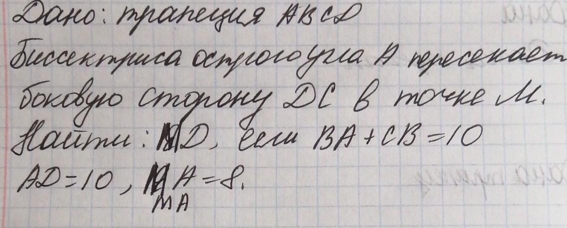 Отложим на стороне AD точку К так, что KD=BC. Соединим точки В и К. Тогда KBMD- параллелограмм ( по признаку 2 противоположные стороны равны и параллельны) .