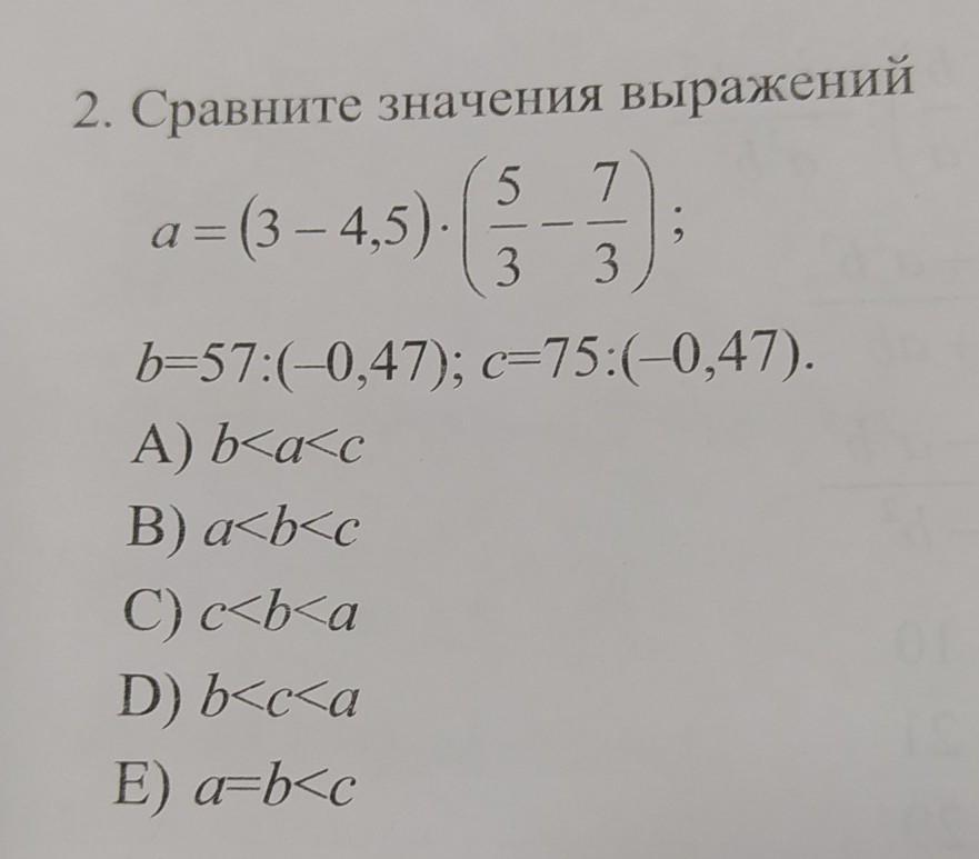 a=(3-4.5)*(\frac{5}{3}-\frac{7}{3} )=(-1.5)*(-\frac{2}{3} )=1\\\\b=57:(-0.47)=\frac{57}{100} :(-\frac{47}{100} )=-\frac{57}{47} \\\\c=75:(-0.47)=\frac{75}{100} :(-\frac{47}{100} )=-\frac{75}{47} \\\\-\frac{75}{47}<-\frac{57}{47} <1