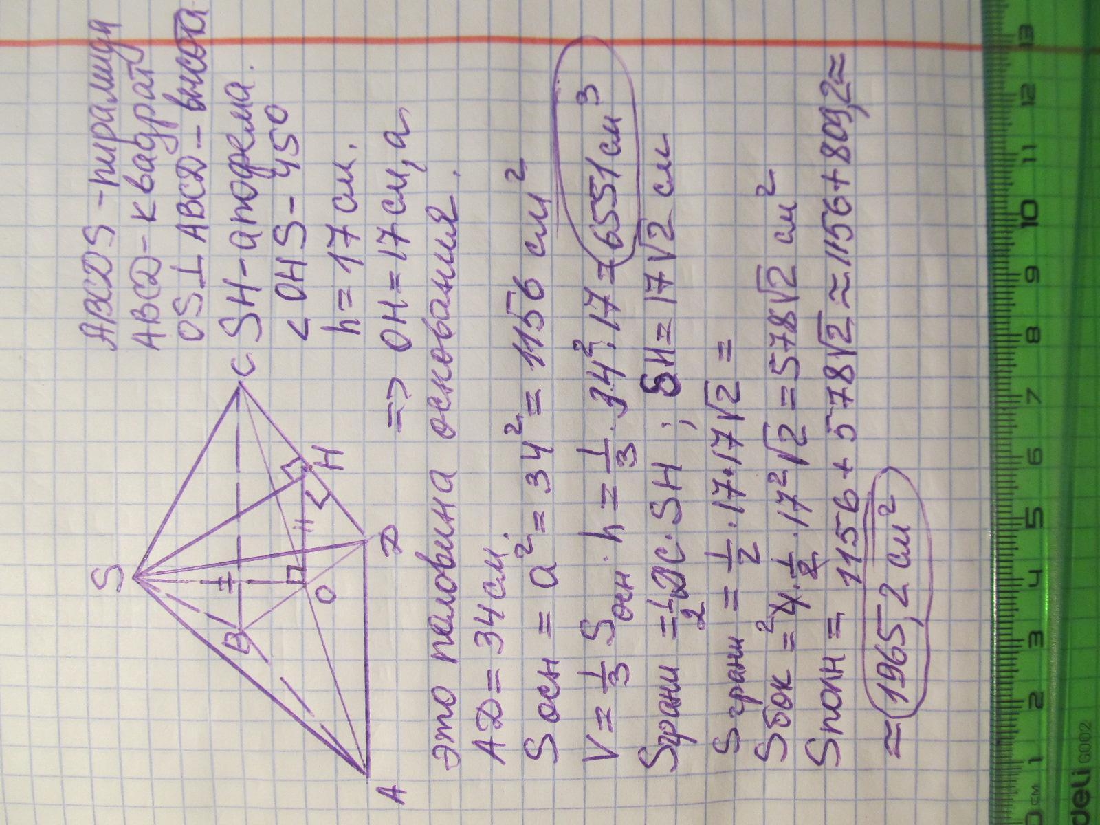 В правильной четырехугольной пирамиде апофема образует с плоскостью основания угол 45°, высота пирамиды 17 см. Найдите площадь полной поверхности и объем пирамиды
